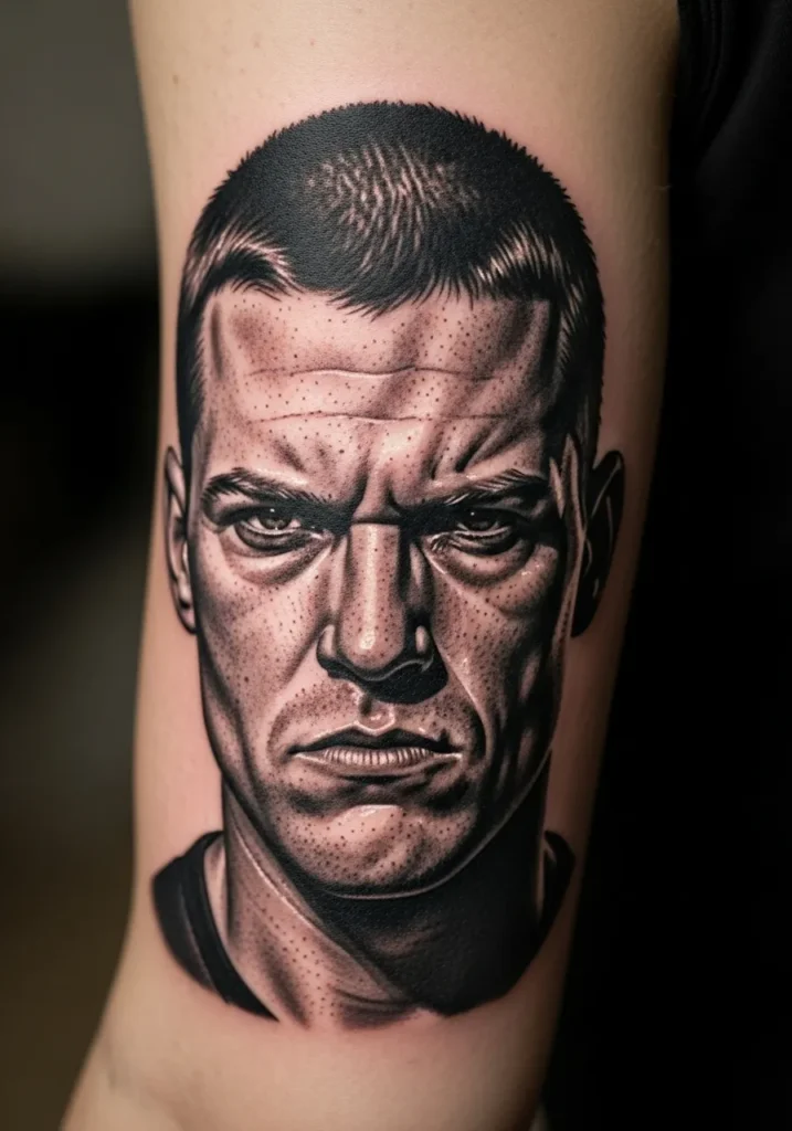 This upper arm tattoo captures a man’s fierce, focused expression in bold black and gray. The strong contrast, sharp line work, and finely textured shading give it a strikingly realistic look. Every pore and wrinkle is meticulously inked, adding to its intensity.
