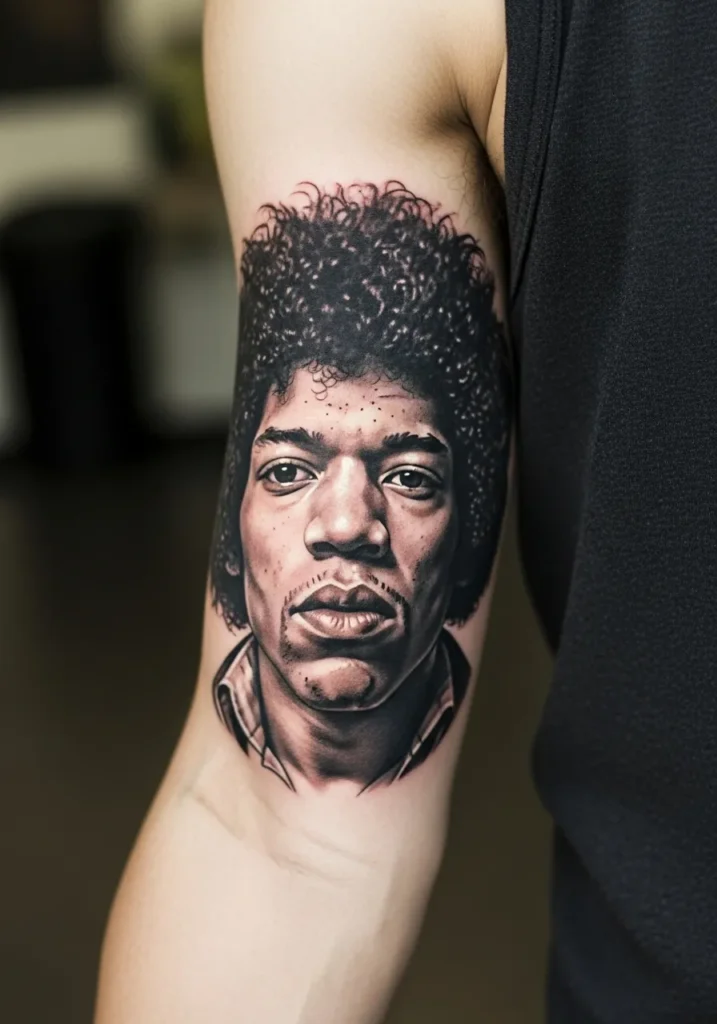This arm tattoo features a legendary musician rendered in breathtaking realism. The rich tones, detailed facial texture, and perfect hair shading make it feel like a still from a photograph. The use of light and shadow adds depth and presence that draws you in instantly.