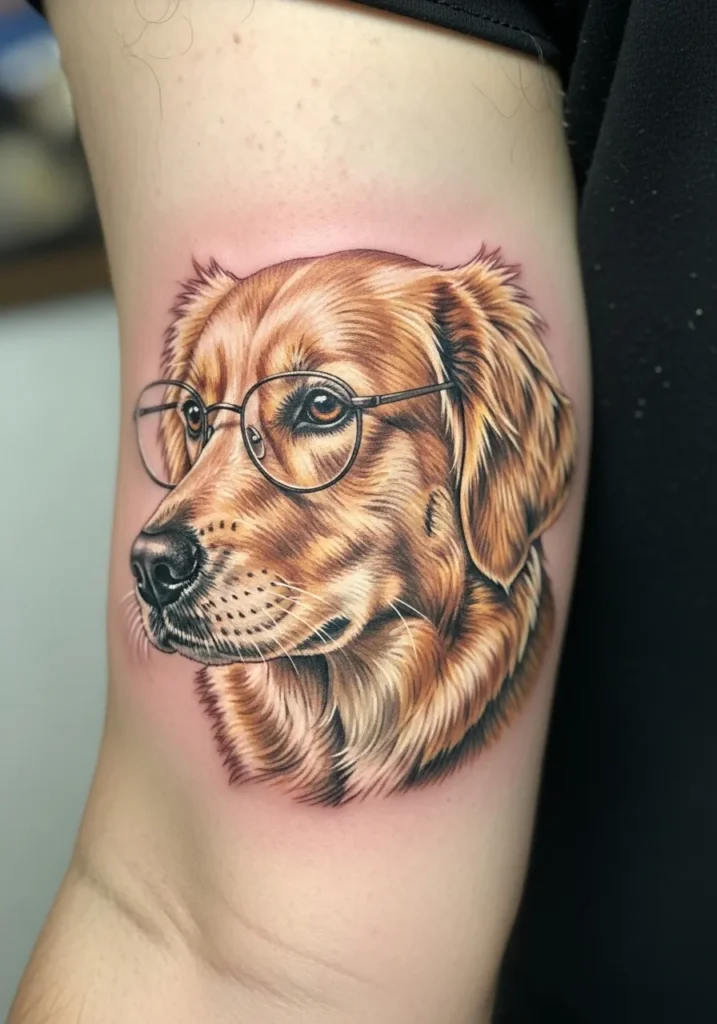 This lifelike realism tattoo shows a golden retriever wearing round glasses, perfectly placed on the upper arm. The color palette blends warm golds and soft browns with fine line detail to give the fur that silky, realistic texture. The glasses add a playful touch that makes this piece feel full of love and humor.
