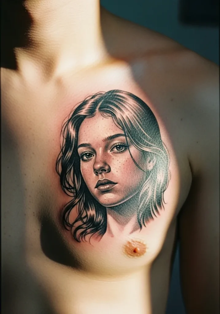 Placed beautifully on the upper chest, this portrait tattoo captures the quiet strength of a young woman with soft shading and delicate tones. The fine detailing in her freckles and hair strands gives the design a breathtaking realism, while the subtle play of light and shadow creates a gentle, soulful atmosphere.
