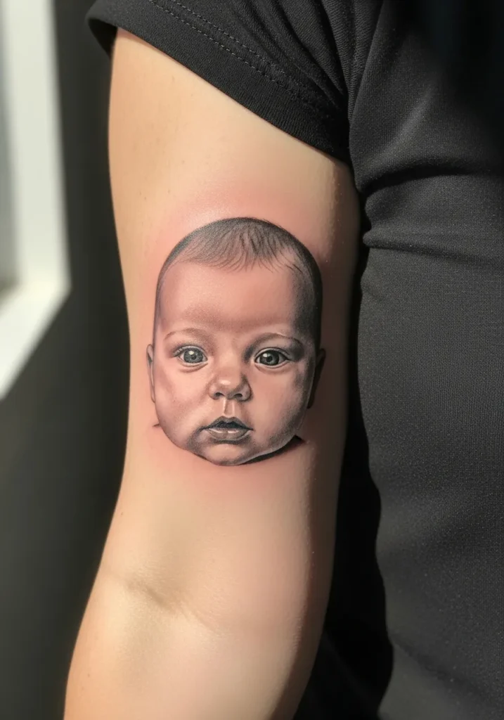 This tender baby portrait tattoo, inked on the upper arm, uses black and gray realism to create a serene and angelic expression. The smooth shading, gentle blush tones, and precise highlights bring this little face to life, making it look almost photographic.
