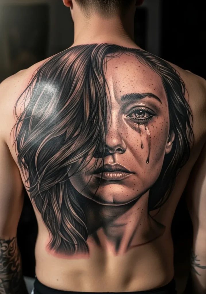 Covering most of the back, this portrait tattoo of a woman with tears falling down her cheek is hauntingly beautiful. The fine details in the freckles, wet skin, and hair texture show incredible artistry. The muted color palette and dramatic shading make it look like a scene straight out of a movie still.
