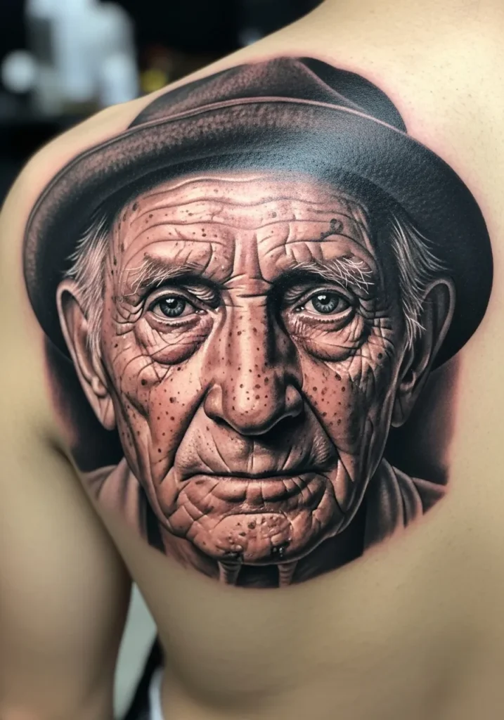 This large shoulder tattoo depicts an elderly man wearing a hat, every wrinkle and freckle rendered in flawless detail. The warm sepia tones and smooth gradients bring a nostalgic, almost vintage vibe to the piece. The realism is so precise that it feels like you could reach out and feel the life experience etched in every line.