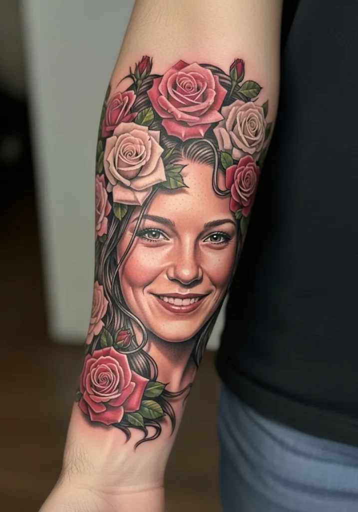 This stunning forearm tattoo blends realism and floral art beautifully, featuring a smiling woman surrounded by blooming roses. The soft pinks and reds of the petals contrast against her natural skin tones, while the green leaves frame her face in a delicate, almost crown-like design. The lifelike shading and subtle highlights make her expression glow with warmth and personality.