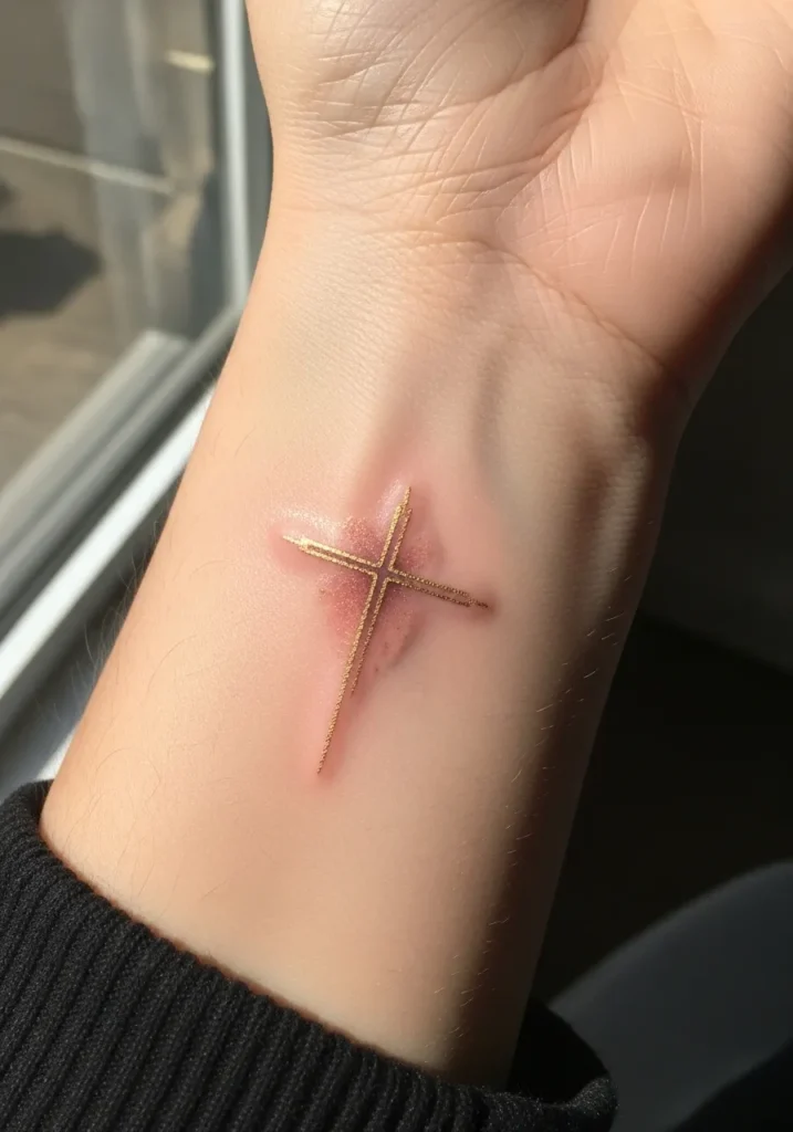 This delicate cross tattoo sits on the inner wrist and is created with thin lines and subtle pink shading. A tiny floral detail adds softness without overpowering the cross itself. The overall look feels clean and feminine.