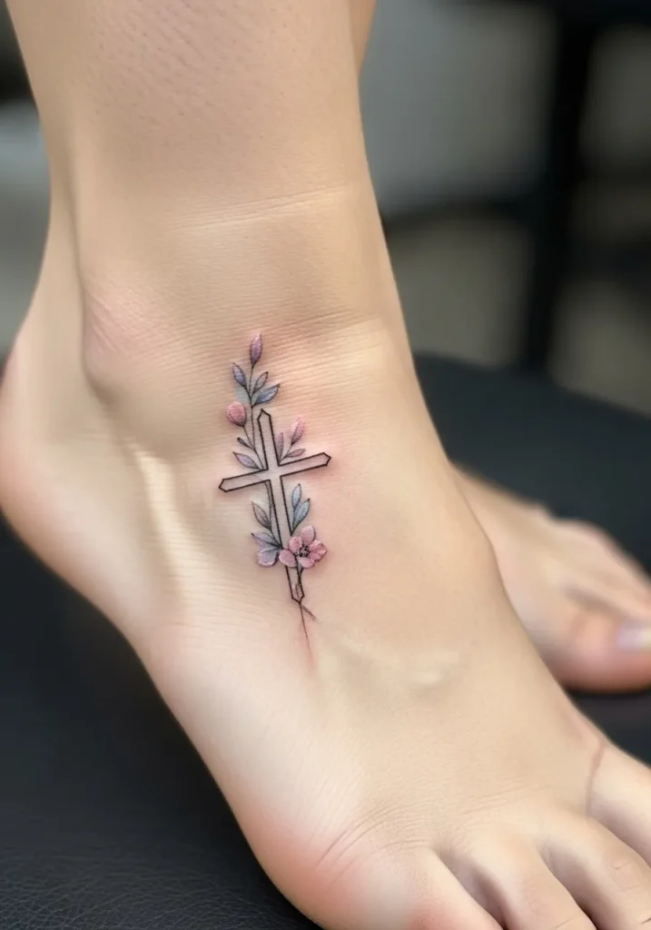 This slim cross tattoo runs vertically along the ankle and is decorated with tiny floral details. Soft muted colors give the flowers a gentle touch while the cross remains the focal point. The placement follows the natural line of the foot which makes it feel elegant and intentional.