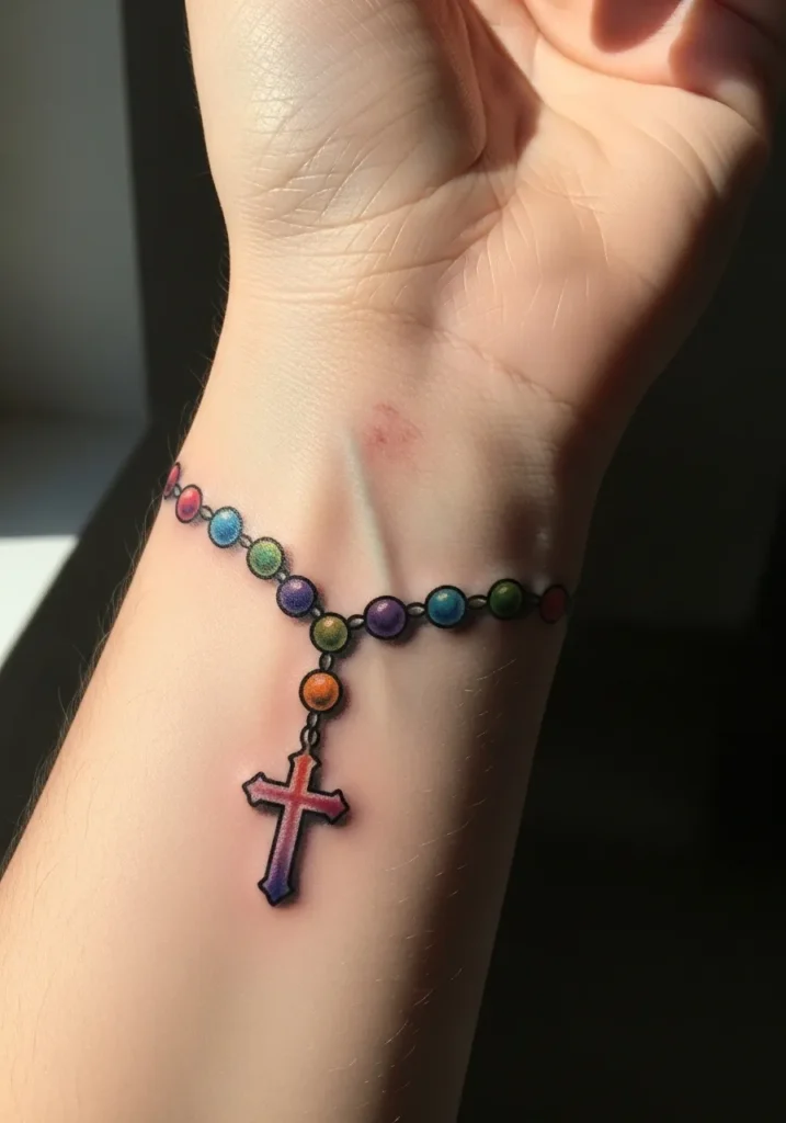 This small rosary tattoo wraps around the wrist like a bracelet with tiny beads and a small cross charm. Subtle color adds depth while keeping the look refined and light. The placement makes it feel like jewelry rather than traditional ink.