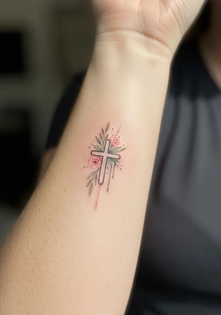 This small cross tattoo is accented with delicate floral elements and placed on the forearm. The linework is light with soft blush tones in the flowers, creating a gentle contrast against the cross. The size stays small and tasteful.