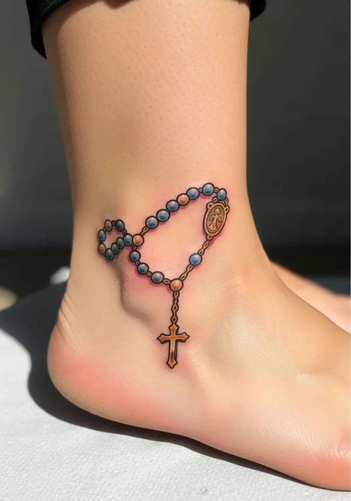 This rosary tattoo wraps gracefully around the ankle like a piece of jewelry, complete with tiny beads and a small cross charm. The linework is clean and precise, with a slightly playful flow that follows the natural curve of the foot. Soft neutral tones keep the look subtle and wearable.