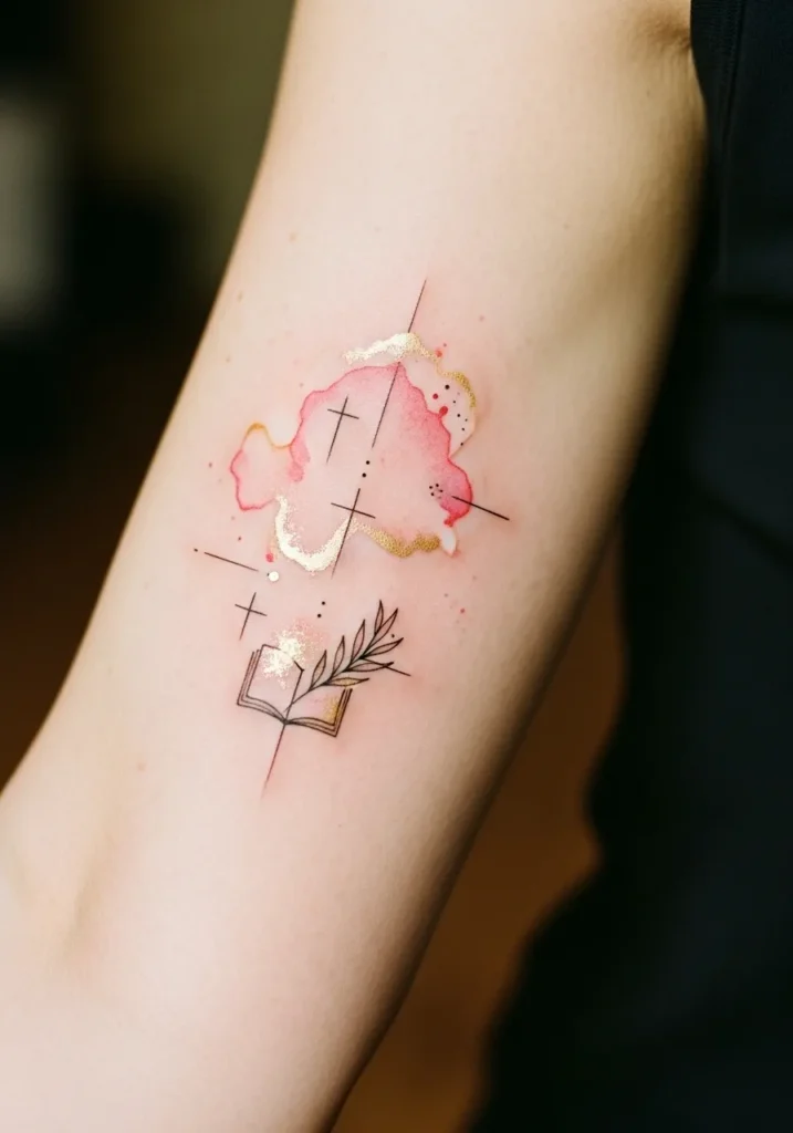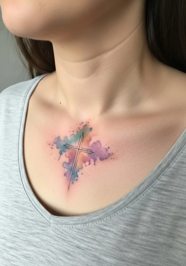 This cross tattoo sits just below the collarbone and is done in a soft watercolor style with pastel splashes. The edges stay light and organic which gives it an artistic feel. The placement makes it visible yet elegant.