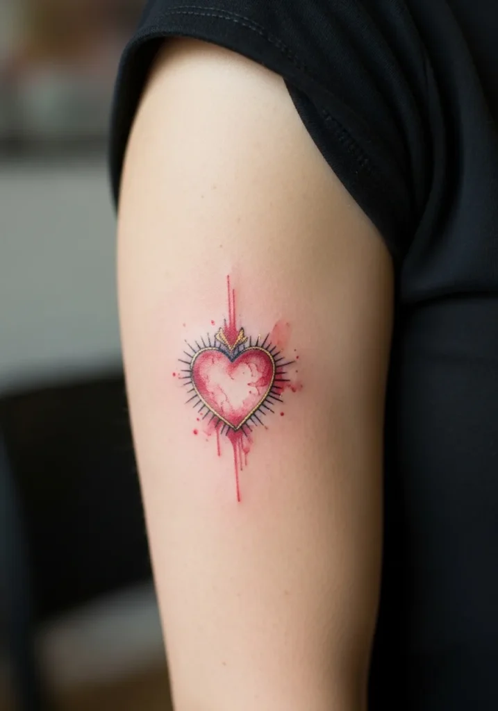 This small sacred heart tattoo is placed on the upper arm and features fine lines with gentle pops of red and pink. The heart has a glowing look thanks to the soft shading and delicate rays that extend outward. The size stays modest while still packing emotional depth.