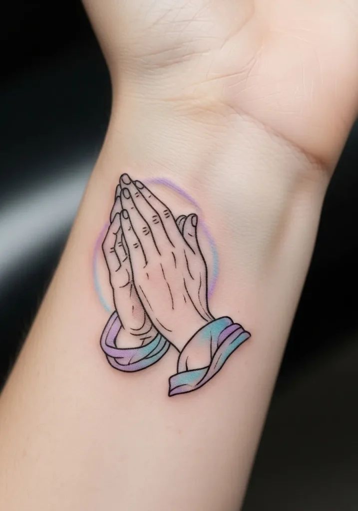 This praying hands tattoo is inked on the forearm using clean outlines and muted pastel tones. The design keeps things simple while still showing clear detail in the hands and cuffs. Its small size makes it feel personal and intentional.