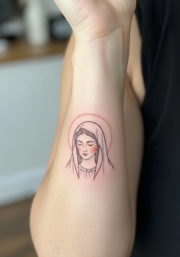 This small Virgin Mary tattoo is placed on the inner arm and features smooth lines with minimal shading. The facial details are gentle and serene, framed by a soft halo outline. The overall look is clean and respectful.