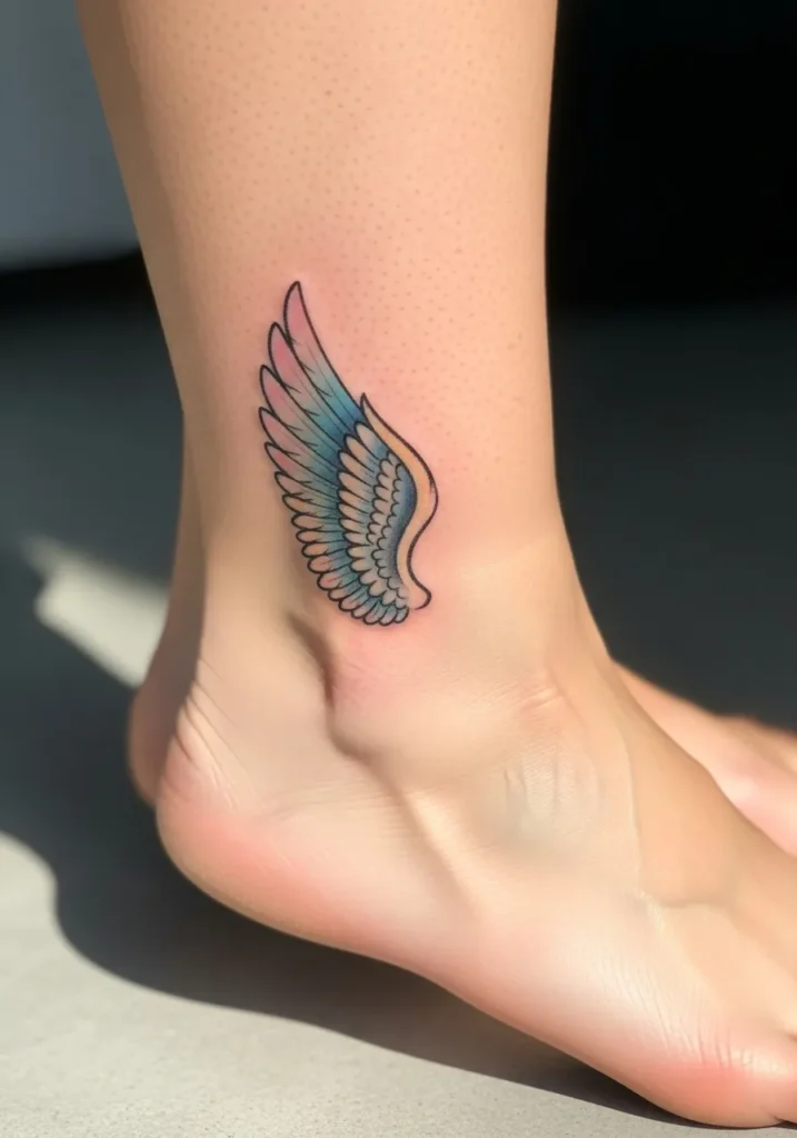 This small angel tattoo is placed just above the ankle and features a simple dark silhouette paired with softly colored wings. The wings fade gently from warm pinks into muted blues, giving the design a light and airy feel. The size stays petite and the placement makes it feel graceful and easy to hide.