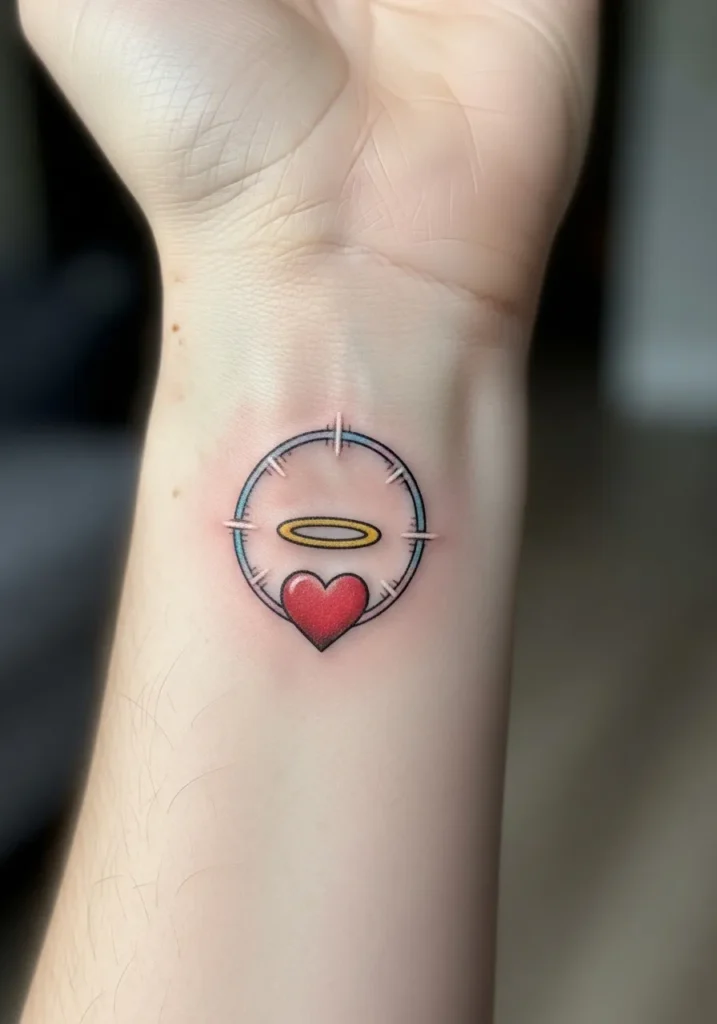 This small tattoo sits neatly on the inner wrist and features a simple heart topped with a thin halo. The linework is clean and fine with soft red tones in the heart and gentle shading that keeps it looking light. The size feels delicate and perfectly suited for a subtle everyday placement.