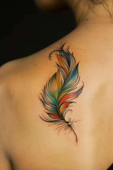 This stunning pride tattoo features a delicate feather design, flowing effortlessly along the curve of the shoulder. The feather is filled with a rich rainbow gradient that blends red, orange, yellow, green, blue, and violet into one beautifully cohesive piece. Fine black lines give it structure without taking away from the bold color, and subtle dotted accents add that extra whimsical touch. The placement on the upper back makes it feel both elegant and free-spirited.