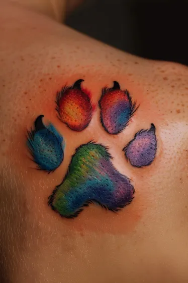 This playful LGBTQ+ tattoo features a bold and colorful paw print, made entirely of soft, furry rainbow hues. Each toe pad is tinted in a different vibrant shade, from fiery red and orange to deep blue and purple. The texture gives the impression of actual fur, which makes it feel warm and full of personality. It’s placed on the shoulder in a way that feels spontaneous and expressive, like a little stamp of joy and identity.