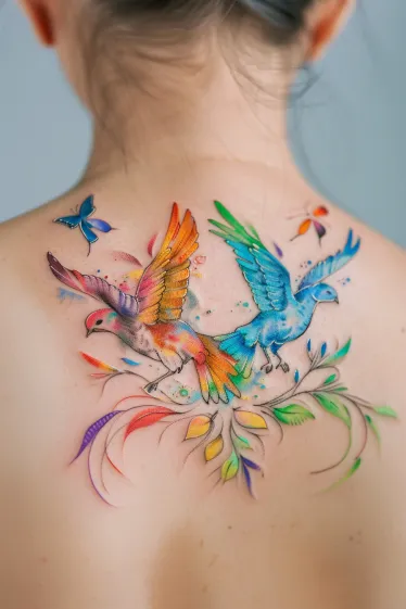 This eye-catching pride tattoo features two vibrant birds in mid-flight, surrounded by delicate rainbow feathers and playful butterflies. One bird glows in fiery reds and oranges while the other radiates cool blues and greens, creating a perfect balance of warmth and calm. The feathers scattered below feel like falling confetti, and the whole design spreads gracefully across the upper back, giving it a sense of freedom and movement that’s just magical.