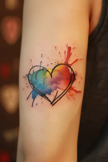 This vibrant pride tattoo shows off a double-outlined heart filled with dreamy rainbow splashes that look like paint was just thrown across the skin. The mix of rich reds, greens, blues, and purples creates a beautiful blend, with little splatters extending beyond the heart like an emotional burst of color. The sketchy black lines add movement and contrast, giving it a super expressive, artsy vibe. It’s placed perfectly on the upper arm, where it catches the light and feels bold without being too big.