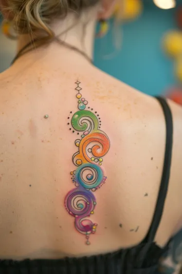 This playful and vibrant pride tattoo features a stacked row of rainbow-colored spirals running straight down the spine, each one unique and framed by tiny dotted accents and jewel-like circles. The swirling motion gives it a flowy, almost meditative energy, while the colors blend beautifully from top to bottom. The placement right along the back makes the whole design feel long, balanced, and eye-catching without being too loud.
