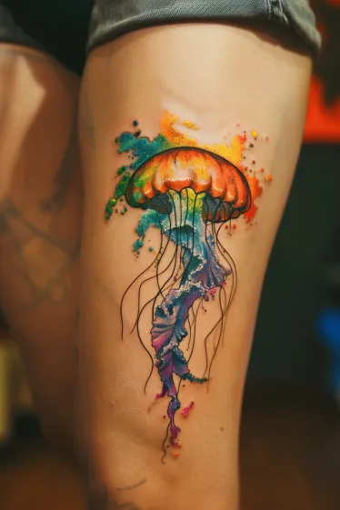 This stunning pride tattoo features a rainbow jellyfish floating gracefully down the thigh, with long, flowing tendrils trailing in dreamy watercolor swirls. The bell of the jellyfish glows in warm orange and red hues, while the tentacles shift through purples, blues, and greens like an underwater rainbow. The watercolor splashes behind it add a burst of energy and softness, giving the whole piece a magical, fluid feel that almost seems to move with the body.