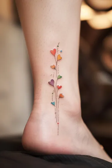 This sweet and delicate pride tattoo features a thin vine winding up the ankle, with tiny hearts in rainbow colors blooming from each stem. The hearts are painted in soft shades of red, orange, yellow, green, blue, and purple, like a little LGBTQ+ garden growing with love. Tiny dotted lines trace the path of the vine, adding a soft rhythm to the design. The placement along the ankle gives it a whimsical, dainty feel that’s both feminine and meaningful.