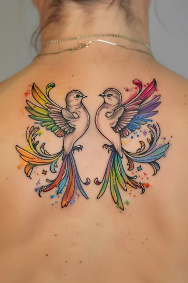 This charming pride tattoo features two lovebirds facing each other across the upper back, with their wings and tail feathers exploding in full rainbow glory. Each bird is outlined with clean black lines and softly shaded bodies, while the wings and tails are a burst of colorful magic with subtle sparkles and playful accents. The symmetry between them is so satisfying, and the mirrored design makes it feel balanced and full of harmony.