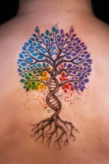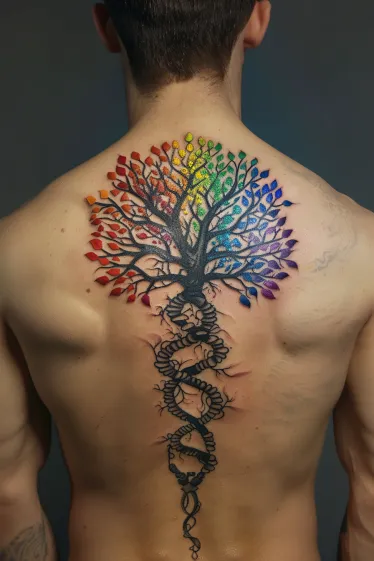 This powerful pride tattoo showcases a stunning tree of life design with its branches and roots intricately formed around a central DNA helix. The leaves burst into a vibrant rainbow, blending purples, blues, greens, yellows, and reds with a soft watercolor touch that adds dimension and energy. The deep black trunk and twisted roots ground the piece with strength, while the DNA spiral running through the middle makes it feel deeply personal, like queerness and identity are woven into every part of your being.