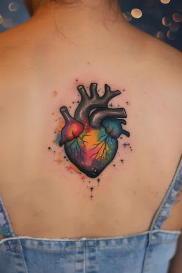 This bold pride tattoo features a realistic anatomical heart brought to life with a stunning rainbow gradient across the lower half. The arteries and veins pop in inky black with subtle highlights, while the vibrant blend of reds, oranges, yellows, greens, and purples pulses through the center like it’s lit from within. A soft spray of watercolor stars adds a dreamy background effect that balances out the bold black shading with a little magic and sparkle.