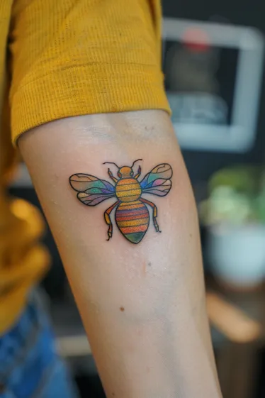This adorable pride tattoo features a buzzing little bee with a fabulous twist. Its body is inked with classic rainbow stripes that stretch from bright red through to violet, while the delicate wings shimmer with transparent pride colors that almost feel like stained glass. The clean black outlines give it structure without taking away from the softness of the color palette, and its placement on the forearm makes it sweetly visible.