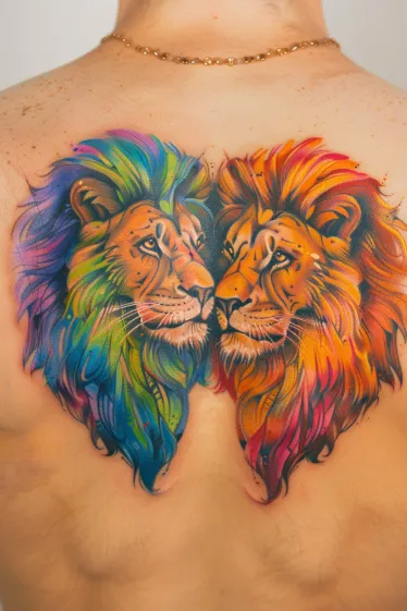 This breathtaking pride tattoo shows two majestic lions face to face, their manes flowing in opposite ends of the rainbow spectrum. One lion glows in cool shades of blue, green, and violet, while the other burns bright with warm tones of red, orange, and yellow. They’re placed beautifully on the upper back, almost like a mirror of balance, strength, and connection. The detailing is so lifelike, and yet the color play gives it a dreamy, artistic edge.