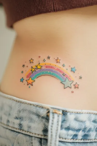 This adorable lower back tattoo features a pastel rainbow arched with soft shades of pink, orange, yellow, green, and blue. Surrounding the rainbow is a magical sprinkle of colorful stars in varying sizes, giving it a dreamy, cosmic vibe. The lines are clean and playful, and there’s just the right amount of sparkle to make it feel like it came straight out of a fairytale. It’s small, sweet, and full of personality.