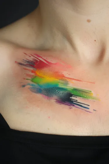 This pride tattoo looks like a brushstroke straight off an artist’s canvas. Positioned just below the collarbone, it features bold streaks of rainbow color in a watercolor style that feels expressive and wild in the best way. The edges blur and drip slightly, like the ink is still drying, adding a splash of spontaneity to the design. It’s abstract, fierce, and totally unapologetic.