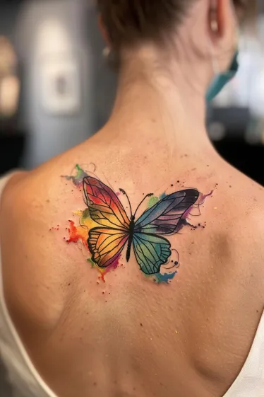 This gorgeous back tattoo features a butterfly that’s been kissed by every shade of the rainbow. Its delicate wings are outlined in fine black ink, while the insides burst with watercolor blends of red, orange, yellow, green, blue, and purple. The edges of the colors softly fade into each other, almost like a dreamy splash of ink that happened to land in the perfect butterfly shape. It’s fluid, vibrant, and full of movement, like the wings are about to flutter.