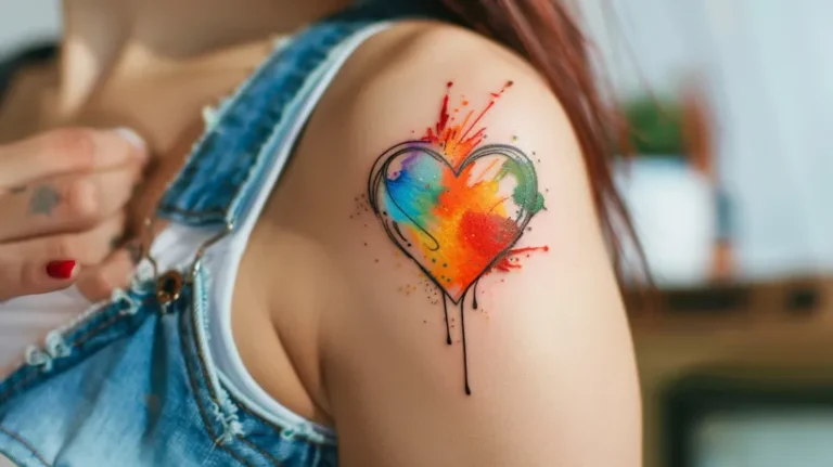 This vibrant pride tattoo shows off a double-outlined heart filled with dreamy rainbow splashes that look like paint was just thrown across the skin. The mix of rich reds, greens, blues, and purples creates a beautiful blend, with little splatters extending beyond the heart like an emotional burst of color. The sketchy black lines add movement and contrast, giving it a super expressive, artsy vibe. It’s placed perfectly on the upper arm, where it catches the light and feels bold without being too big.