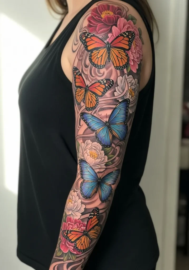 This full sleeve bursts with life through vibrant realism, showing orange and blue butterflies fluttering among lush pink peonies. The tattoo stretches from shoulder to wrist, with each detail perfectly balanced between color and softness. The petals look almost touchable, and the fine linework around the wings gives a sense of delicate movement. The overall design feels feminine yet bold, capturing a stunning mix of nature and artistry.