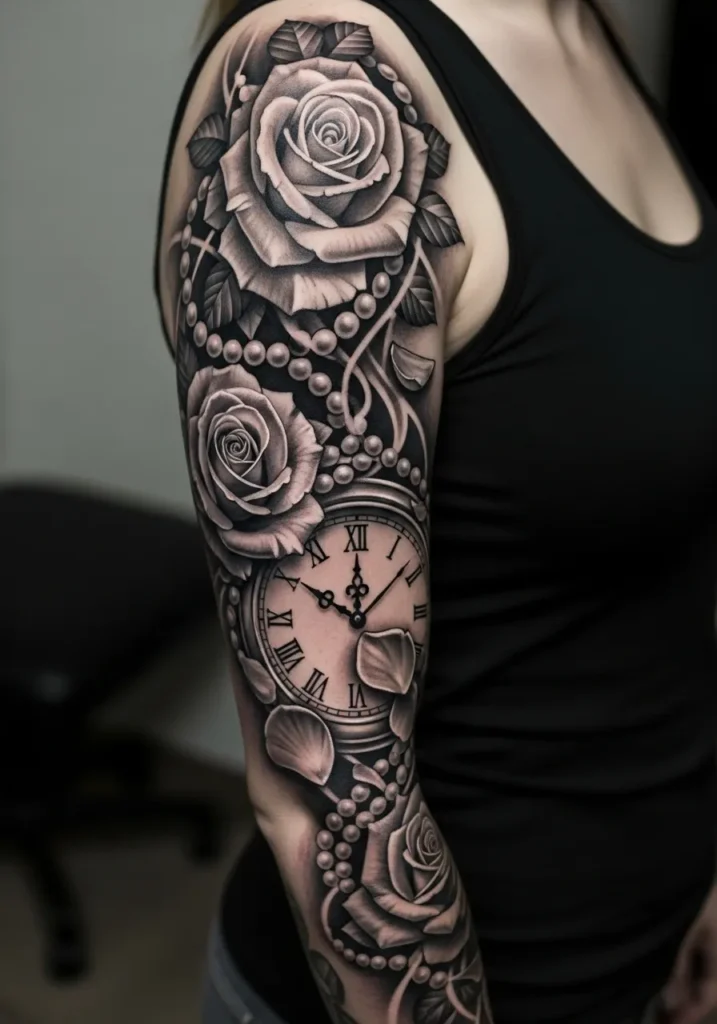 This elegant black and grey realism sleeve features large blooming roses intertwined with pearls and a vintage clock face. The shading work is incredibly smooth, giving the petals and pearls a lifelike texture. The clock sits beautifully near the elbow, blending seamlessly into the floral flow that runs up the arm.