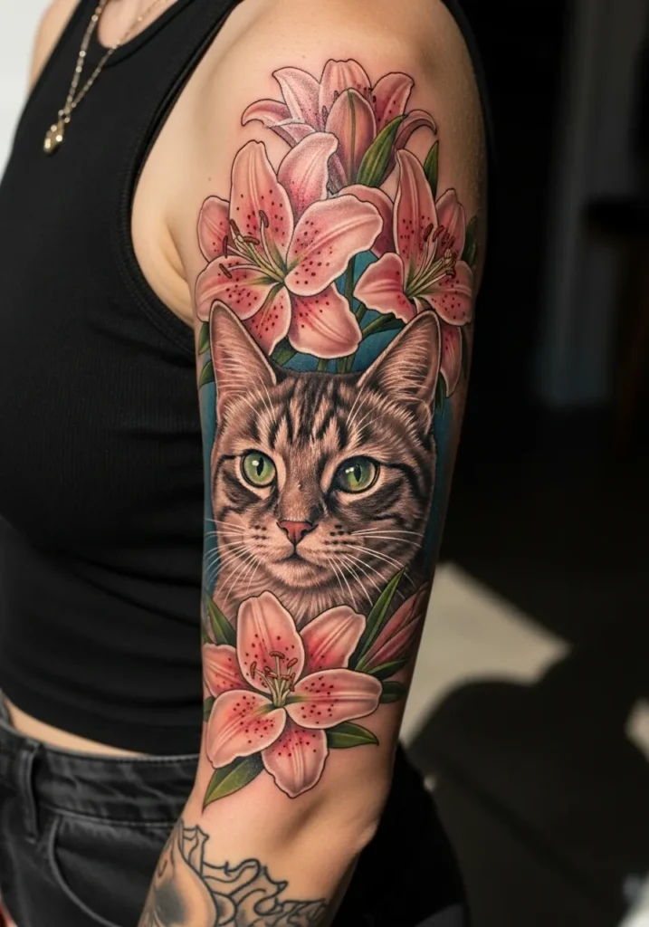 This adorable realism piece showcases a lifelike cat surrounded by pink lilies in full bloom. The mix of the cat’s soft fur and the vibrant flower petals creates a lovely contrast, while the detailed shading makes everything look three-dimensional. The placement on the upper arm gives it the perfect balance of cute and elegant.