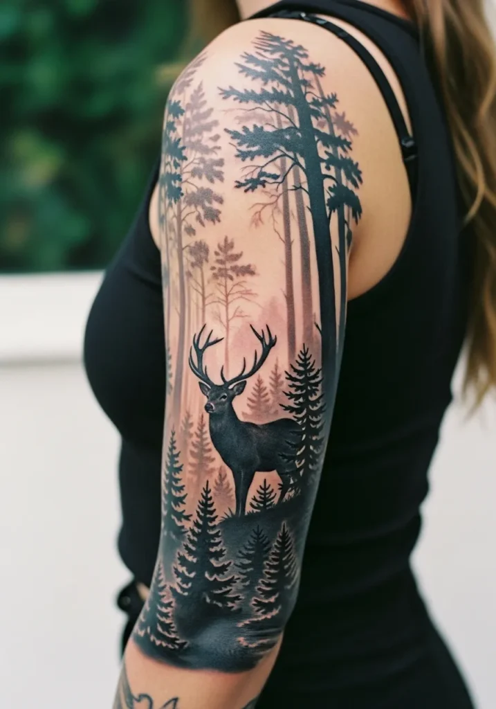 This serene black and grey sleeve brings nature to life with a peaceful deer standing among tall pine trees. The misty forest effect fades beautifully into the skin, creating a sense of depth and calm. The balance of dark silhouettes and soft shading makes it both bold and soothing.