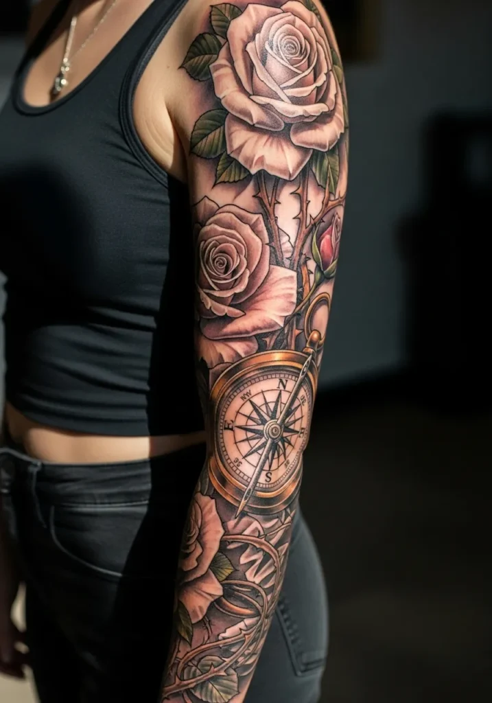 This full sleeve blends soft pink roses with a realistic compass near the wrist. The shading is immaculate, giving every petal and metallic detail a sense of depth and realism. The design wraps naturally around the arm, creating a harmonious mix of elegance and direction.