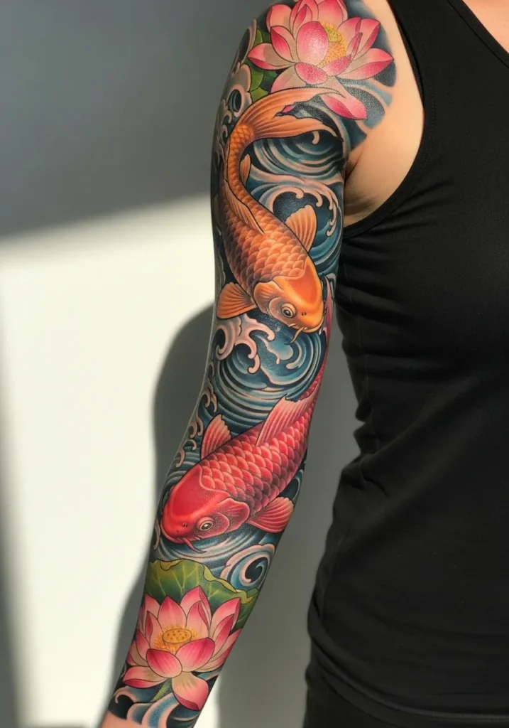 This radiant sleeve features two vibrant koi fish swimming through swirling blue waters, surrounded by pink lotus blossoms. The bold colors and flowing motion make it look alive, while the detailed scales and water ripples give the tattoo incredible depth. The full-arm placement allows every element to breathe, creating perfect harmony between movement and calm.