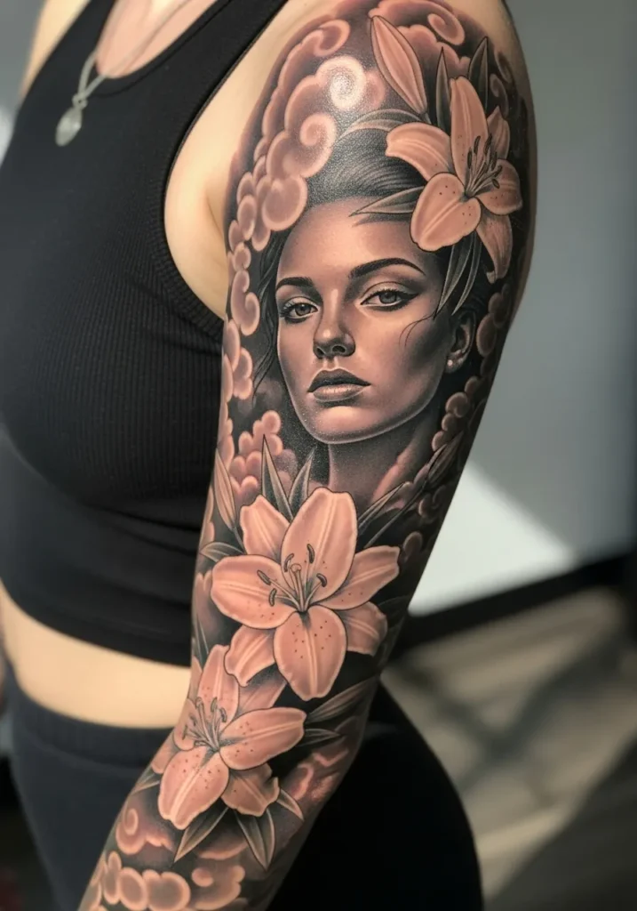 This breathtaking realism sleeve features a serene woman’s face surrounded by soft lilies and swirling clouds. The monochrome tones enhance every smooth gradient, giving the tattoo a timeless glow. The flowers frame the portrait beautifully, and the placement on the upper arm draws attention to the gentle yet powerful expression in her eyes.