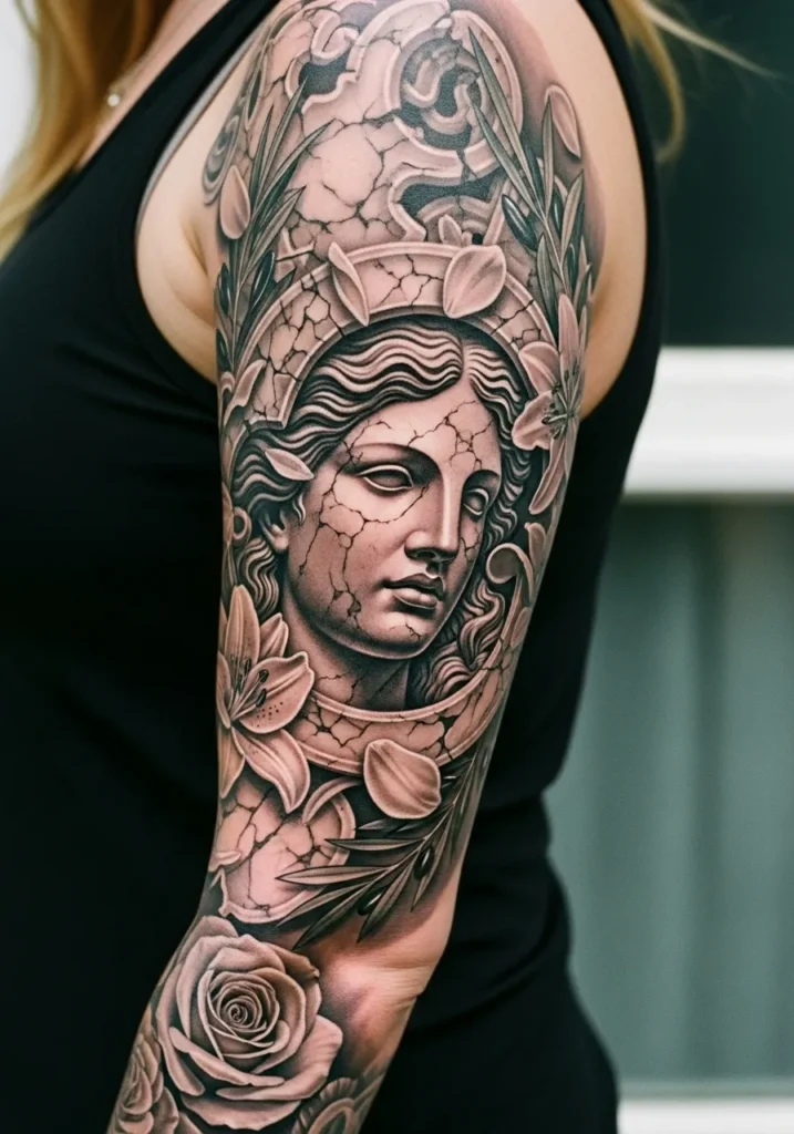 This black and grey realism tattoo portrays a cracked marble statue of a goddess framed by roses and leaves. The fine details in the stone texture give it a lifelike quality, as if the sculpture could move at any moment. The design flows beautifully from shoulder to wrist, blending classical art with modern tattoo mastery.