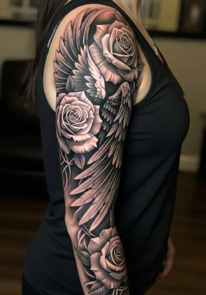 This stunning sleeve pairs soft, shaded roses with angelic wings spread across the arm. The monochrome tones give it a dreamy, sculptural look, and the intricate feather work adds elegance and depth. The seamless transitions between the flowers and wings make the design flow effortlessly.