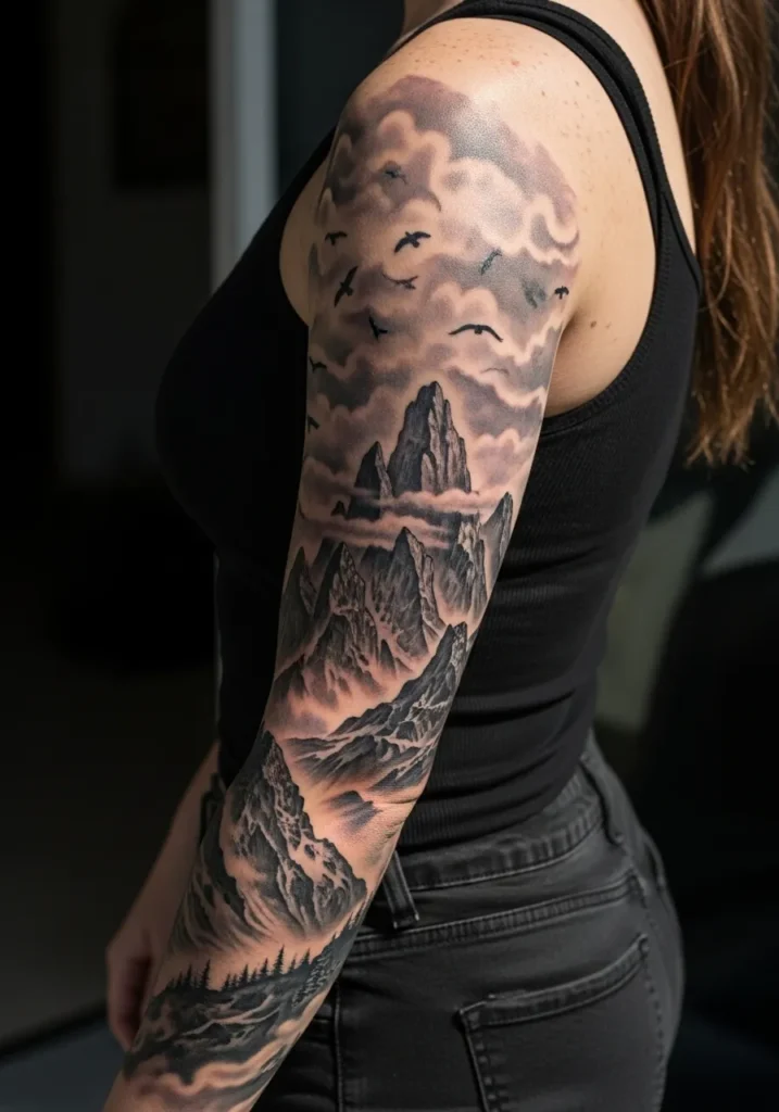 This breathtaking sleeve captures a mountain landscape beneath swirling clouds and flying birds. The shading creates a moody atmosphere, with peaks fading into mist. It’s a perfect example of how realism tattoos can feel cinematic and alive even without color.