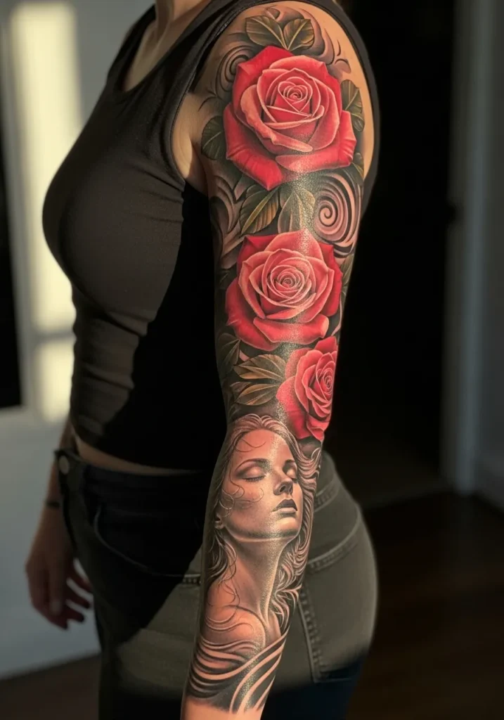 This bold realism sleeve combines striking red roses with a soft, grayscale portrait of a serene woman. The roses glow under natural light, while the detailed shading of the face adds emotional depth. Together, they create a perfect balance of color and monochrome beauty.