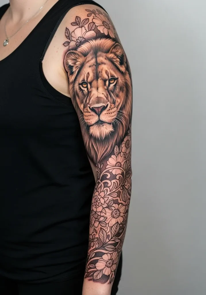 This majestic sleeve combines the face of a lion with detailed floral patterns flowing down the arm. The shading transitions effortlessly from deep blacks to warm golden hues, making the lion look alive. The lower half is filled with ornamental flowers that soften the design while keeping it cohesive.