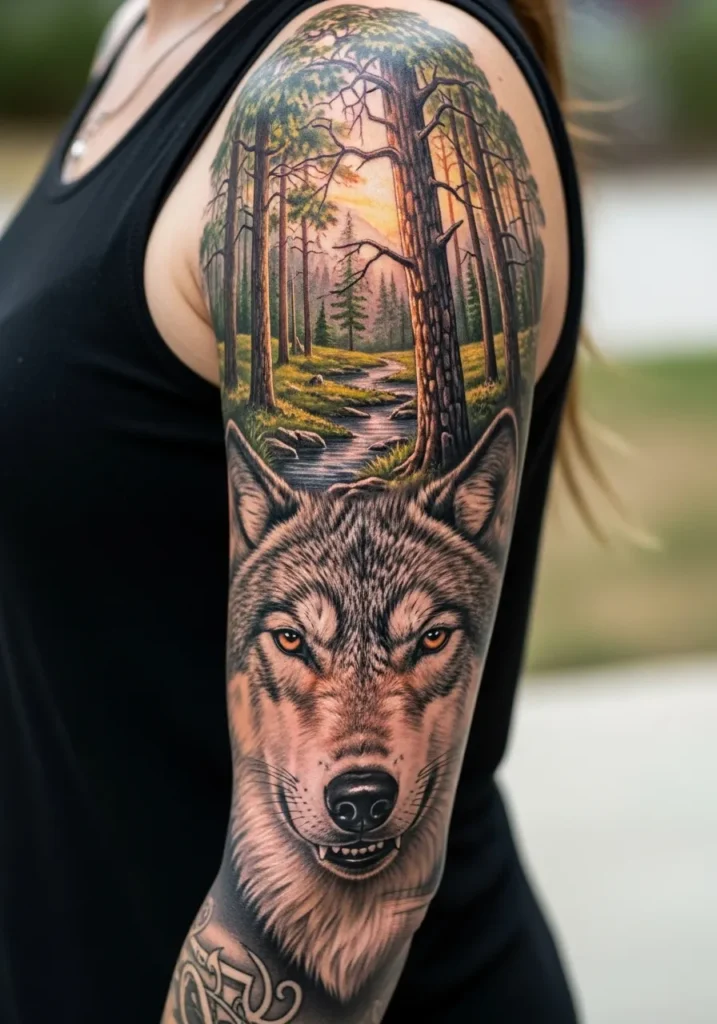 This realism tattoo paints an entire story on the arm, blending a lifelike wolf with a peaceful forest scene. The details are stunning, from the texture of the fur to the warm sunset filtering through the trees. Every part of the sleeve connects seamlessly, creating a natural flow that looks both fierce and serene.