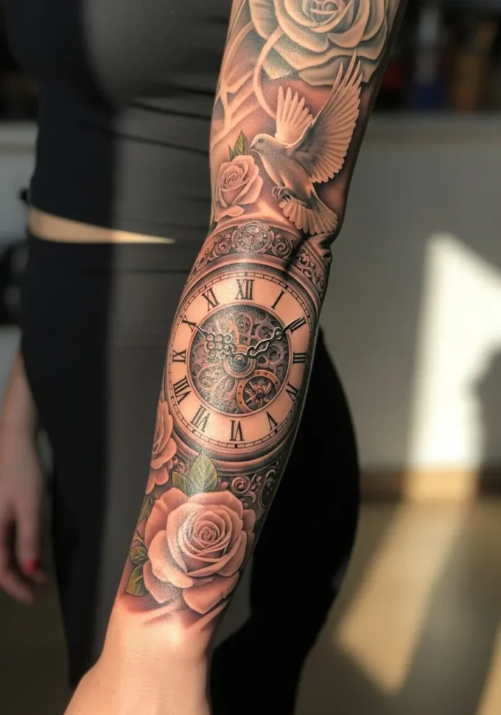 This sleeve blends time and beauty with intricate realism. A detailed pocket watch sits near the elbow, surrounded by soft roses and a white dove in flight. The shading is flawless, with metallic highlights on the clock and smooth gradients on the petals. It’s the perfect balance between mechanical precision and organic grace.