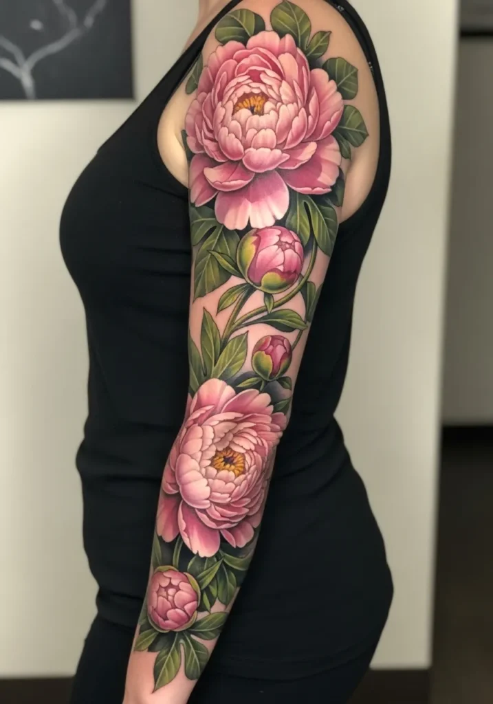 This gorgeous sleeve is a burst of blooming pink peonies wrapping gracefully around the arm. The realism is flawless, with every petal showing depth and softness through subtle shading. The lush green leaves frame the flowers perfectly, and the placement gives a gentle, flowing rhythm to the whole piece.